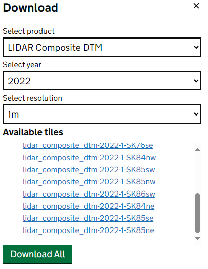 The tiles available for download are organised based upon product, year and resolution in three lists. There may be a delay of up to a couple of minutes while the data is prepared before the download starts. If the area you've selected is too large, you may need to submit a Large Data Request.