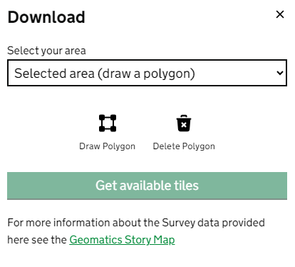 There is the option to either draw a polygon or upload a shapefile of an area of interest using the download tab. A registered user of the DSP will have a predefine area of interest displayed. By clicking ‘Get available tiles’ a list of tiles will appear that are available for download.
