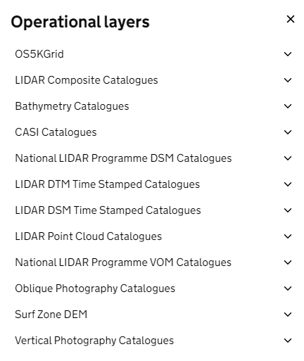 A list of Operational layers is displayed. The layers can be togged on and off to see what is available in an area of interest. The layers do not need to be selected to be downloadable.